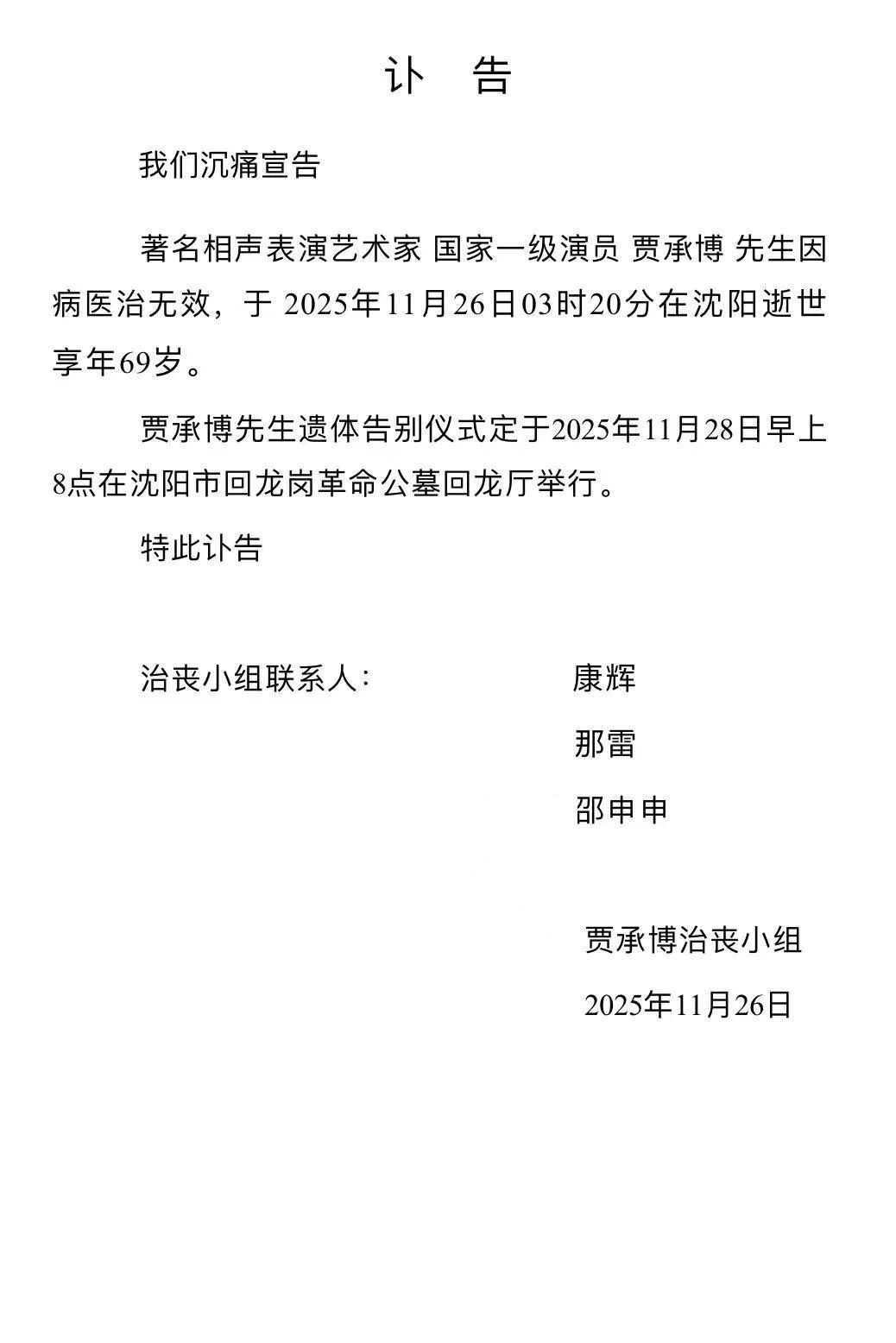 时木新闻记者王励勤报道,11月26日凌晨,著名相声艺术家、主演贾成波在沉阳因病去世,享年69岁。贾成波(图片来源:指尖新闻)贾成波出生于1956年,年轻时就接触过演戏,是受过良好教育的青年文艺推广队的一员,后来加入沉阳民间艺术团。 1976年加入剧团。1997年获辽宁西岗杯相声比赛金奖。 2006年,与张彬荣合作相声《加盟赢大奖》,获得第三届中央电视台相声大赛专业组特等奖。贾成波(右一)(来源:指尖新闻)2007年,贾成波凭借相声《晋级》获得第二届辽宁民间艺术牡丹奖表演奖。此后,参与电视剧《女人村》等影视作品的制作。贾成波(来源:智健新闻)时盟新闻记者注意到,贾成波曾多次登上中央电视台、辽宁卫视的舞台。2006年,贾成波、郭冬临、杨蕾主演的小品《考验爸爸妈妈》登上了同年辽宁卫视的春节联欢晚会。之后,他的小品又出演了辽宁卫视春节联欢晚会。 2007年、2011年、2025年多次春晚,贾成波在辽宁卫视《幸福调调》中饰演“贾刘”一角,深受观众喜爱。凭借对“贾柳”这个角色的生动刻画,这部作品引起了很多关注。贾呈波还透露,自己希望将“贾刘”这个人物发展成一个系列,展现不同行业生活的不同侧面。 11月26日,吉姆新闻记者致电贾成波的殡葬团队。据消息人士透露,贾成波于11月26日因突发疾病在沉阳去世。该病的具体病因尚未透露。贾成波的作品深受70、80后人们的喜爱。公众的喜爱给大家带来了许多美好的回忆。告别仪式仪式将在沈阳回龙观革命公墓举行。据贾成波家人透露,喜欢贾成波的粉丝朋友将可以参加11月28日的告别仪式。