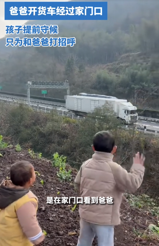 两个小身影看向高速公路立交桥。一辆大卡车从远处驶来,孩子们跳了起来,热情地挥手致意。当卡车驶过桥下时,两声警报声明显响起,双闪灯无声闪烁。